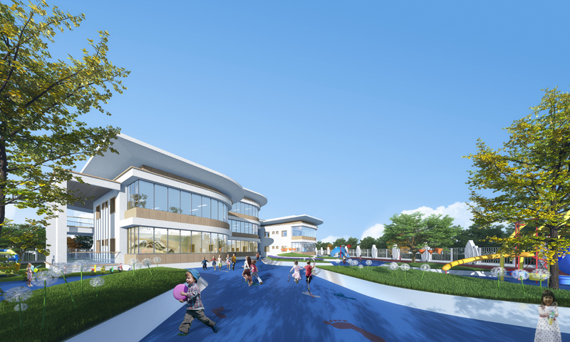 本项目位于旌阳区紫金山路与钱塘江路交会处东北角,幼儿园建筑呈南北布置,幼儿园主入口设置在西侧紫金山路 ,幼儿园区内部机动车位考虑在地下室,车库出入口位于场地西北角。设计理念以枝为廊,以叶作舍;错落有致、清新淡雅的建筑与高低映衬的花草灌木融为一体形成生气盎然的自然之美,给予幼儿足够的温馨、快乐与幸福。