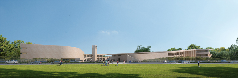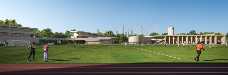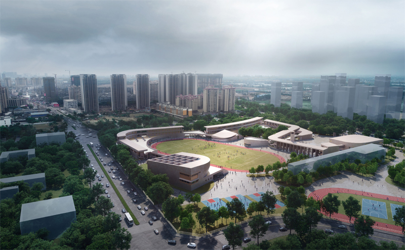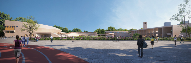 设计将操场置于整个场地中心,自由型跑道打破传统的重复环绕的形式,穿梭于建筑、广场、树林之中,为学生的体育训练带来耳目一新的体验。 新建建筑体量和原有教学楼以足球场为中心形成围合,为校园公共活动场所营造活力,同时形成连续的校园界面。新教学区建筑体量高低错落,围合出连续又层级丰富的院落空间, 身在其中犹如穿梭于城市街巷,趣味横生。